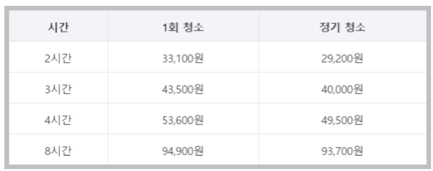 미소라는 청소를 위주로 하는 청도우미 플랫폼에서는 횟수, 정기 청소의 시급이 표로 잘 정리되어있기에 가져와봤습니다.