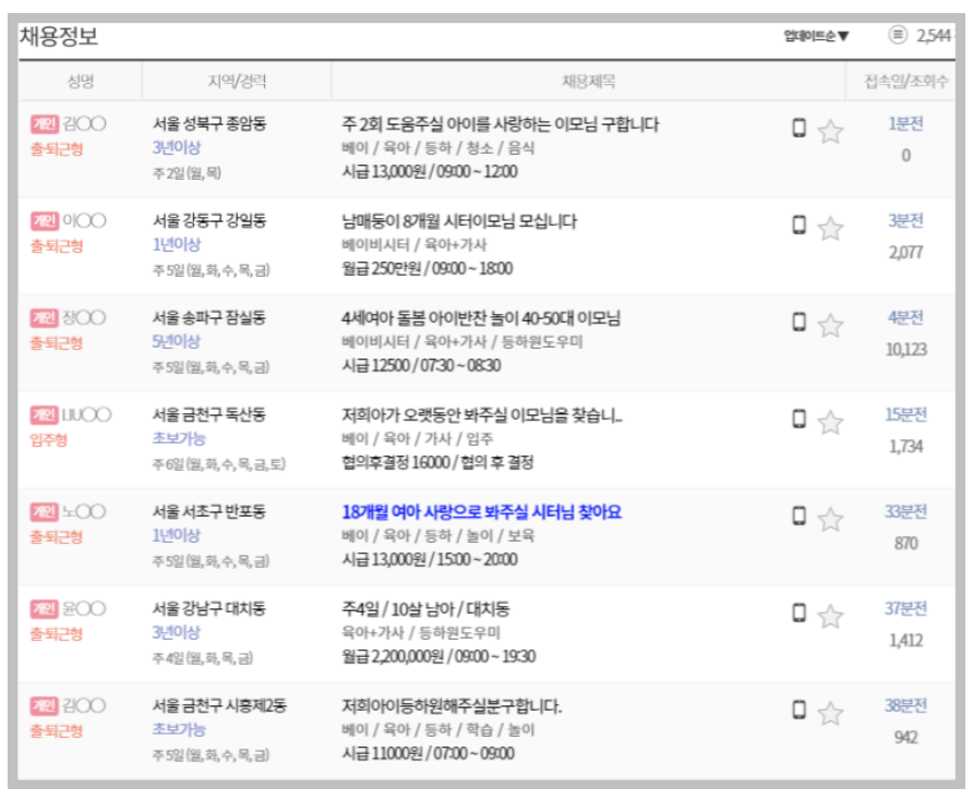 다음과 같이 사진을 보면 현재 시세를 알 수 있습니다. 시급을 보면 만원보다 조금 높은 금액으로 형성되어있습니다. 하지만 이는 주5일 가는등의 정기적인 경우의 가격이고 근무시간이 짧아지고 횟수로 한다면 시급이 더 올라간다고 합니다.