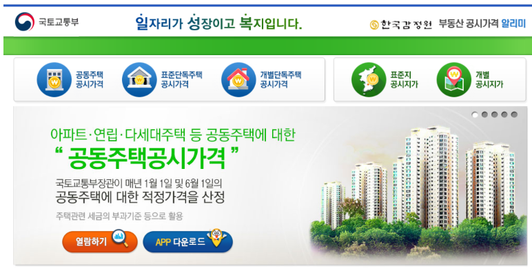 해당 홈페이지에서는 국토교통부 장관이 매년 1월1일 및 6월 1일의 적정가경을 산정한 내용을 열람할 수 있습니다. 화면 가장 상단 메뉴바에서 공시가격을 확인할 수 있는데, 공동주택, 표준단독주택, 그리고 개별단독주택을 별로 확인할 수 있습니다. 이 외에도 표준지와 개별 공시지가를 확인할 수 있습니다.