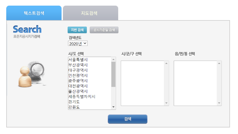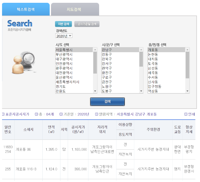 먼저 표준지를 선택하면 다음과 같은 화면이 나타납니다. 여기에서 연도, 시도, 시군구, 읍면동을 선택하면 가격을 확인할 수 있습니다. 텍스트 검색도 가능하지만 지도검색도 가능하니 참고하시길 바랍니다.