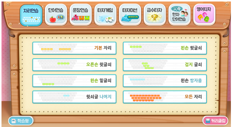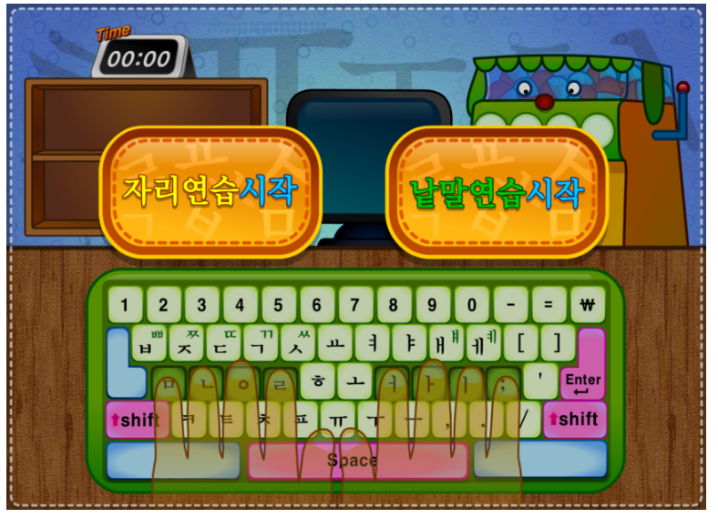 사용 방법은 간단합니다. 먼저 자리 화면을 통해 키보드를 익숙하게 만들어줍니다. 예쁘게 디자인된 키보드 이미지 위에 손가락을 하나씩 올려놓으면서 학습하는 것이죠. 초등학생들도 이러한 컨텐츠에 흥미를 가질 것 같아요.