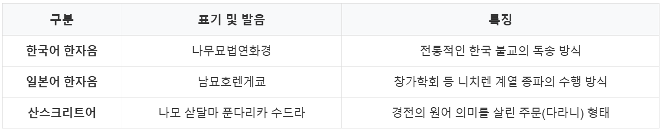 이 문구는 현대 대중들에게 일본어 발음인 '남묘호렌게쿄'로 더 익숙하게 알려져 있기도 합니다. 이는 일본의 승려 니치렌(日蓮)이 법화경의 제목을 외우는 것만으로도 누구나 성불할 수 있다는 수행법을 창시하면서 널리 퍼지게 되었습니다. 오늘날 창가학회(SGI)를 비롯한 니치렌 계열의 종파에서는 전 세계 어디서나 이 일본어 발음 그대로 독경하는 것을 원칙으로 삼고 있으나, 불교계 일각에서는 "부처님의 설법은 각 나라의 언어에 맞게 전하라"는 석가모니 부처님의 유훈에 따라 한국어식 발음이나 현지어로 독송하는 것이 옳다는 견해를 보이기도 합니다.