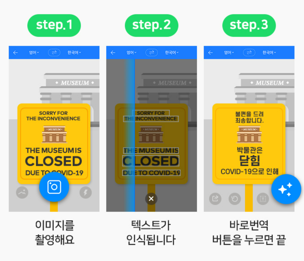 사용 방법은 간단합니다. 파파고 앱을 통해 이미지를 촬영하고, 텍스트가 인식된 후 '바로' 버튼을 누르면 됩니다. 영어가 한글로 바뀌게되는 것이죠. 정말 놀라운 성능이라고 할 수밖에 없습니다. 이러한 기능은 국내에서보다는 해외 여행 중에 효과적으로 사용될 것으로 생각됩니다.