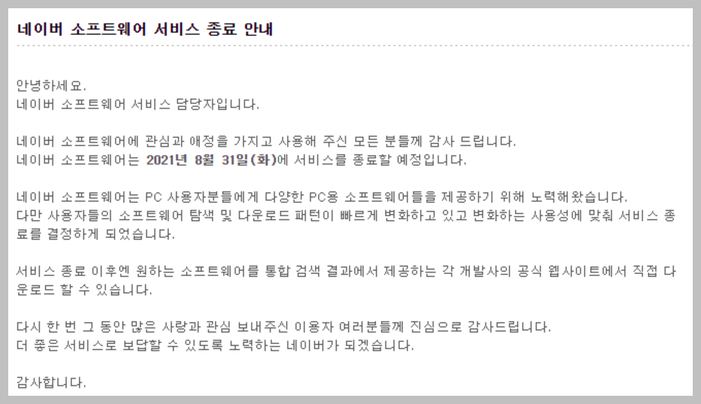 이유는 이렇습니다. 소프트웨어 탐색 및 다운로드 패턴이 변화하고, 변화하는 사용성에 맞춰 서비스 종료를 했다는 것입니다. 사실 납득은 잘 되지 않습니다. 변화한다면 그에 맞게 새로운 서비스를 내놓아야 하는데, 완전히 종료를 하는것은 이해하기는 쉽지 않습니다. 여전히 네이버 소프트웨어 다운로드 서비스는 유효한데 말이지요.