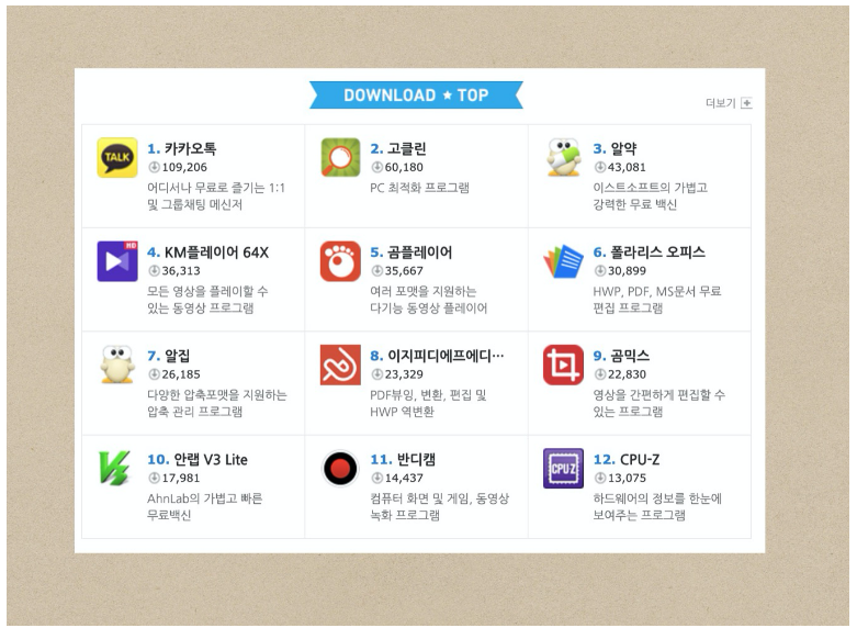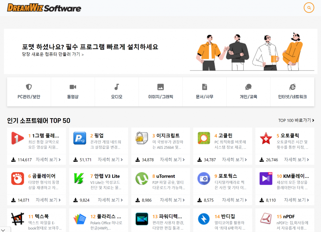 드림위즈는 카테고리별로 정리가 잘 되어있는 것이 특징입니다. 보안, 동영상, 오디오, 이미지로 분류가 되어있는데 각 카테고리별 인기있는 것들을 순위로 매겨져 있어서 더욱 좋은 것 같습니다. 컴퓨터를 새로 구매하셔서 기존에 이용하던 것들을 다시 한번에 다운받기 좋은 곳 같습니다.