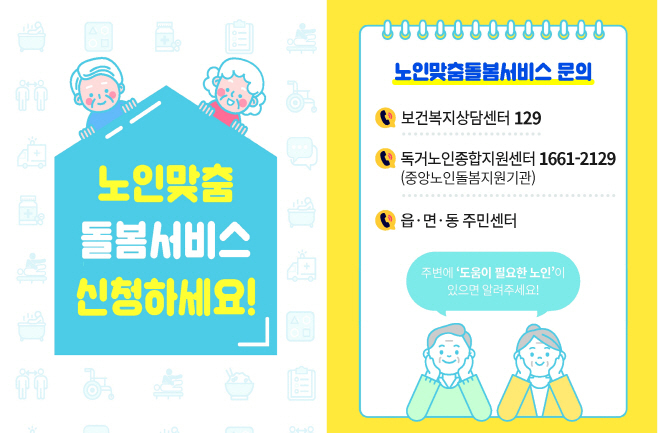 초고령화가 가속화되면서 고령인구를 위한 존의 6개 돌봄사업을 하나로 통합하고 개편하여 새로운 맞춤형 돌봄 서비스를 시작하였습니다. 개편된 맞춤 돌봄 서비스는 어르신들의 필요에 따라 생활관리사에게 요청하면 케어를 직접 받을 수 있는 프로그램입니다.