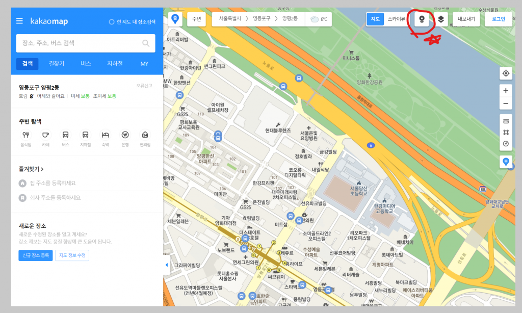 해당지점 주변을 보기 위해서는 화면 오른쪽 위에 있는 '캠' 모양의 아이콘을 선택하면 됩니다.