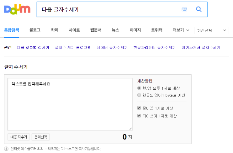 다음에서 '다음 글자수세기'를 검색하면 위 사진과 같은 화면의 프로그램이 나옵니다. 하지만 이 프로그램에는 여러 가지 옵션이 포함되어 있기 때문에 잘 확인하는 것이 좋습니다. 먼저 고민해야 할 사항은 한글과 영어를 모두 1자로 볼지, 아니면 한글은 2자로 볼지에 대한 것입니다. 일반적으로는 모두 1자로 취급하는 것이 적합합니다. 기본 옵션을 유지하는 것이 좋겠죠.