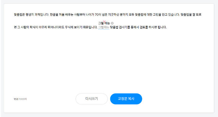 위 링크로 이동하면 부산대 한국어 문법 검사기에 접속할 수 있습니다. 다음보다 더 정밀한 툴을 제공할 뿐만 아니라, 왜 틀렸는지와 올바른 방식에 대한 설명도 제공합니다. 개인적으로는 공부에 더 도움이 되기 때문에 이를 더 좋게 생각합니다.