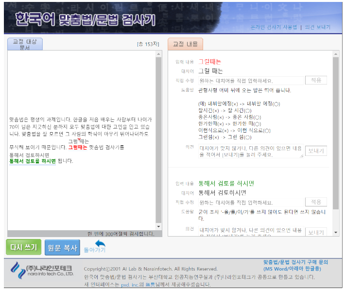 이 웹프로그램은 굉장한 기능을 많이 가지고 있습니다. 다음 문법 검사기는 단지 수정을 해주지만, 맞춤법이 왜 틀렸는지 정확하게 알려주지 않습니다. 그리고 과도하게 체크했는지도 판단하기 어렵지요. 이런 답답함을 해결해주는 사이트가 부산대에서 제공하는 서비스 입니다.