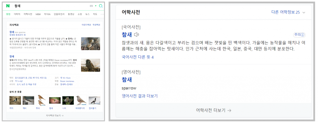 위의 화면은 네이버에서 '참새'를 검색했을 때의 모습입니다. 참새의 크기, 먹이, 수명, 분류, 학명, 서식지 등 다양한 정보 뿐만아니라 어학적인 내용도 제공합니다. 국어사전에서 '참새'를 검색한 결과와 영어로 어떻게 표현되는지도 쉽게 알려줍니다.