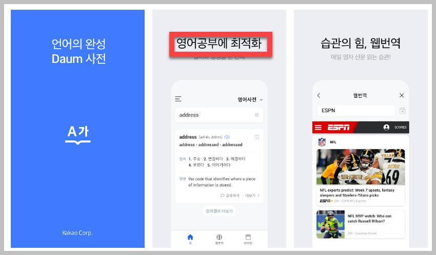 구글 플레이에서 '사전'으로 검색하면 다양한 앱이 나옵니다. 그 중에서 가장 중요한 앱은 네이버와 다음입니다. 이 두 앱은 많은 사람들이 사용하고 활용도도 뛰어납니다. 일상 생활에서는 네이버 좋지만, 공부할 때는 다음 사전 앱을 추천합니다.