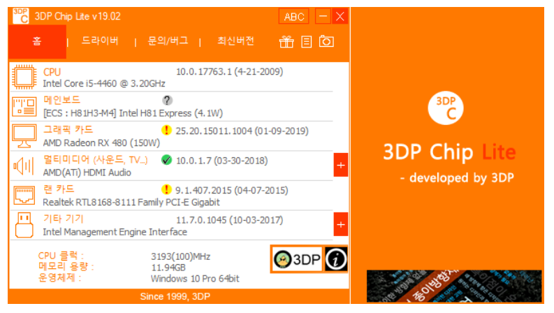 3dp-chip은 CPU, 메인보드, 그래픽 드라이버를 찾아주는 프로그램입니다. 자동으로 최신 버전으로 찾아주기 때문에 포맷할 때마다 사용하는 프로그램입니다.드라이버 자동설치 프로그램라고 할 수 있습니다.