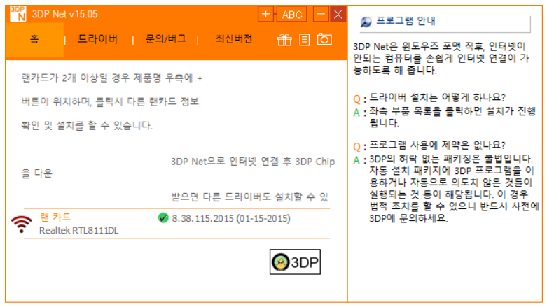 3dp-net은 네트워크 연결이 되지 않는 사람을 위해 랜 카드를 찾아주고 설치해주는 기능을 합니다. 오프라인 다운이 가능하기 때문에 용량이 큽니다. 네트워크 드라이버 자동 설치 소프트웨어라고 할 수 있습니다.