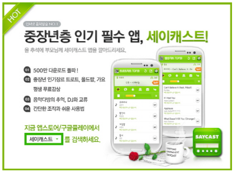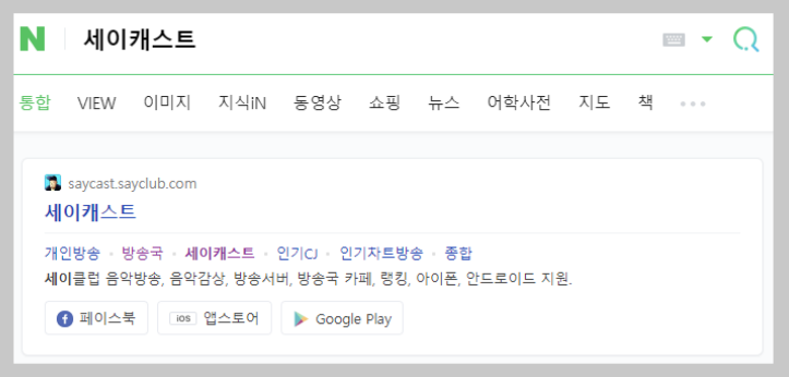 새이클럽 음악방송의 이름이 바로 Saycast 였습니다. Saycast는 인터넷 음악방송 서비스로, 다양한 장르의 음악을 취향에 맞게 들을 수 있습니다. 홈페이지에 접속하기 위해서는 네이버 또는 다음에서 '세이캐스트'로 검색하면 쉽게 접속할 수 있습니다.