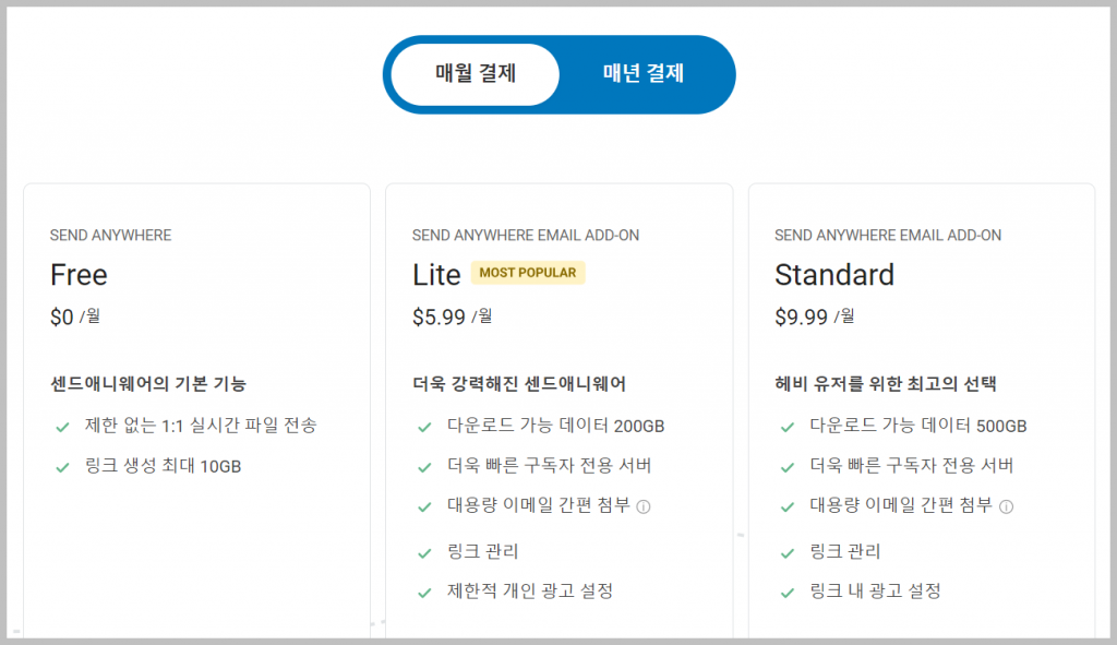 Send anywhere 요금은 위와 같습니다. 매년 결제와 매월 결제로 나눌 수 있으며 라이트와 스텐다드 형 그리고 무료버전이 있습니다. 개인적으로 무료버전도 충분하지만, 더 많은 기능을 원하고, 광고를 보고싶지 않다면 라이트나 스텐다드를 이용하는 것도 좋을 것 같습니다.