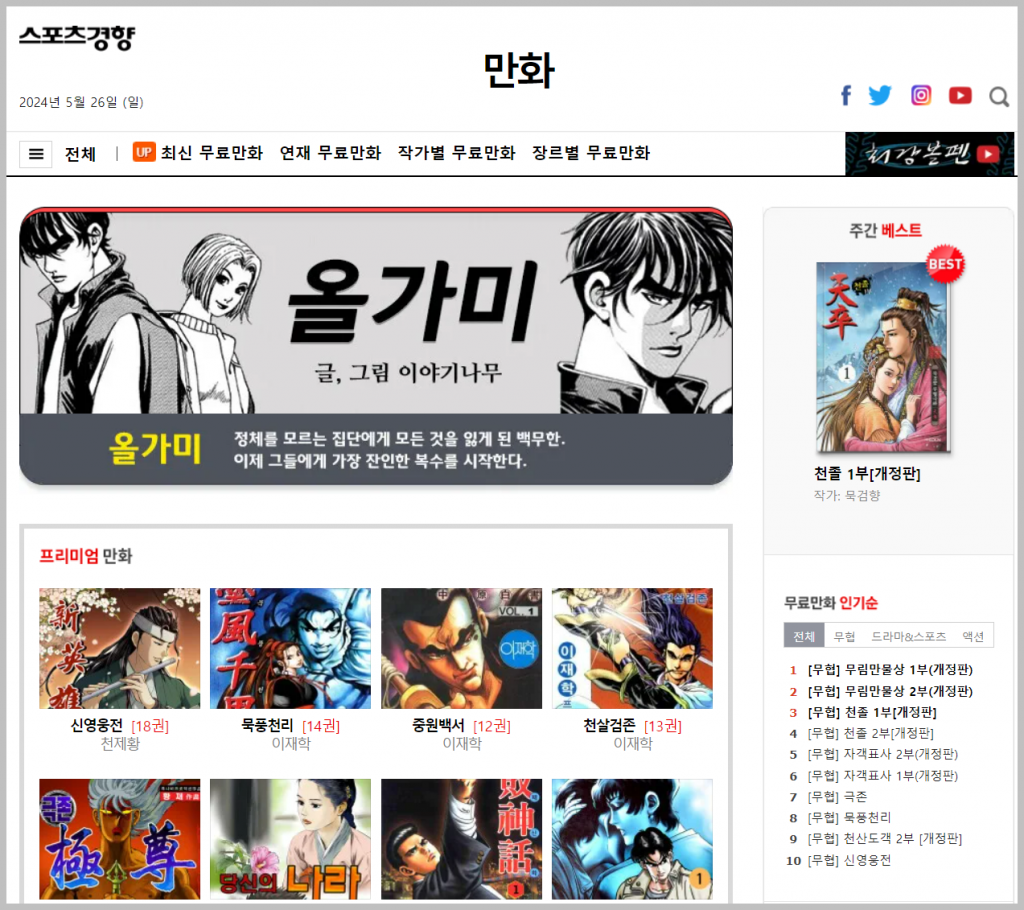 스포츠경향은 다른 무료 만화 사이트와는 다르게 무협 만화가 많이 있습니다. 흔히 말하는 양판소툰이 이런 것이 아닌가 싶습니다. 저처럼 나이가 많은 사람에게는 이러한 무협툰 제격인 것 같아요.