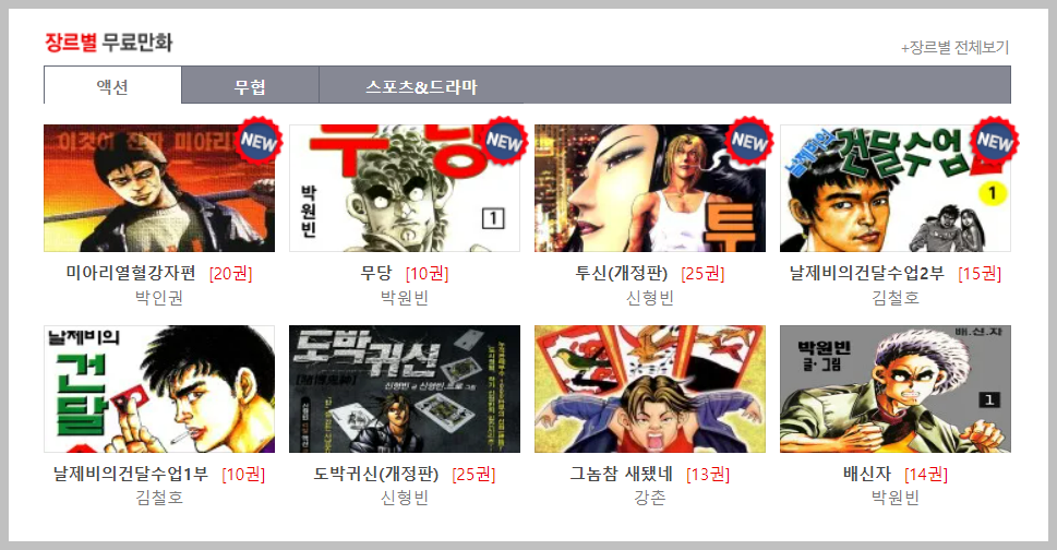 장르별로도 검색이 가능합니다. 무협, 액션, 그리고 스포츠 드라마로 구분되어 있습니다. 본인에게 맞는 장르만 보는 것도 괜찮을 것 같아요. 장르별 전체보기를 클릭하면 해당 장르에 더 많은 작품을 확인할 수 있습니다. 저 같은 경우에는 이것을 주로 활용합니다.