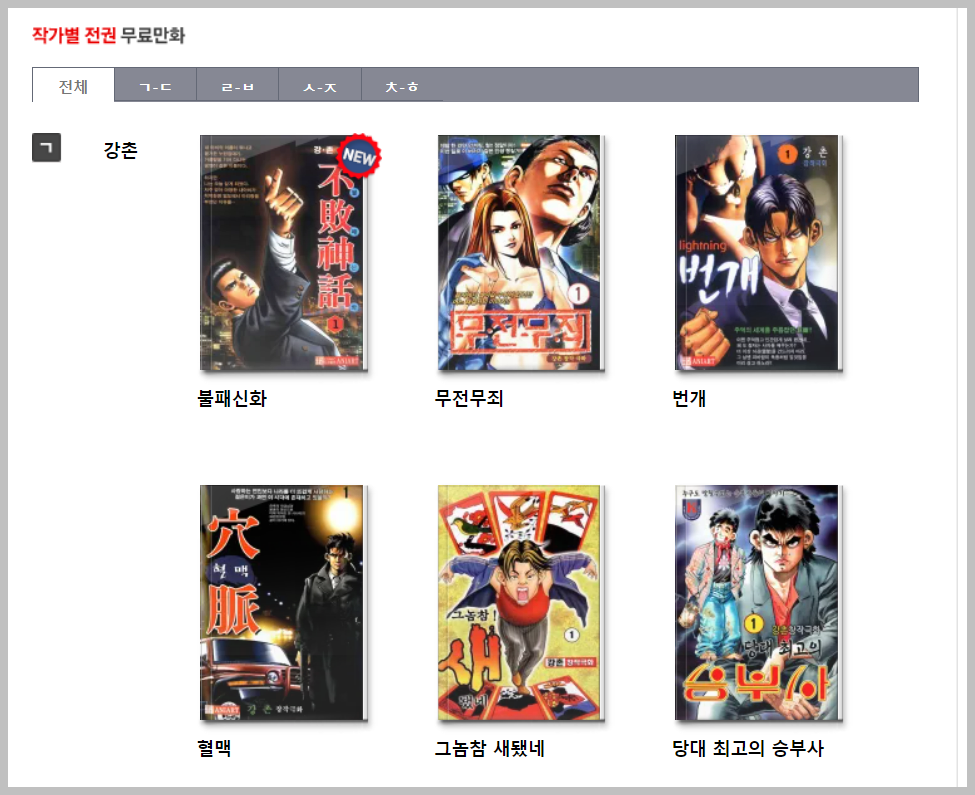 작가별로도 볼 수 있습니다. 가나다 순으로 잘 정리되어 있기 때문에 원하는 작가만 골라서 볼 수 있습니다.오른쪽에는 인기 순위도 있습니다. 인기가 많은 작품은 분명히 이유가 있습니다. 반드시 봐야 하는 것 중 하나입니다. 이처럼 스포츠경향은 정말 많은 작품을 자랑합니다. 이 정도의 저작권을 얻는 것도 쉬운 일이 아닌데 대단하다는 생각이 듭니다.