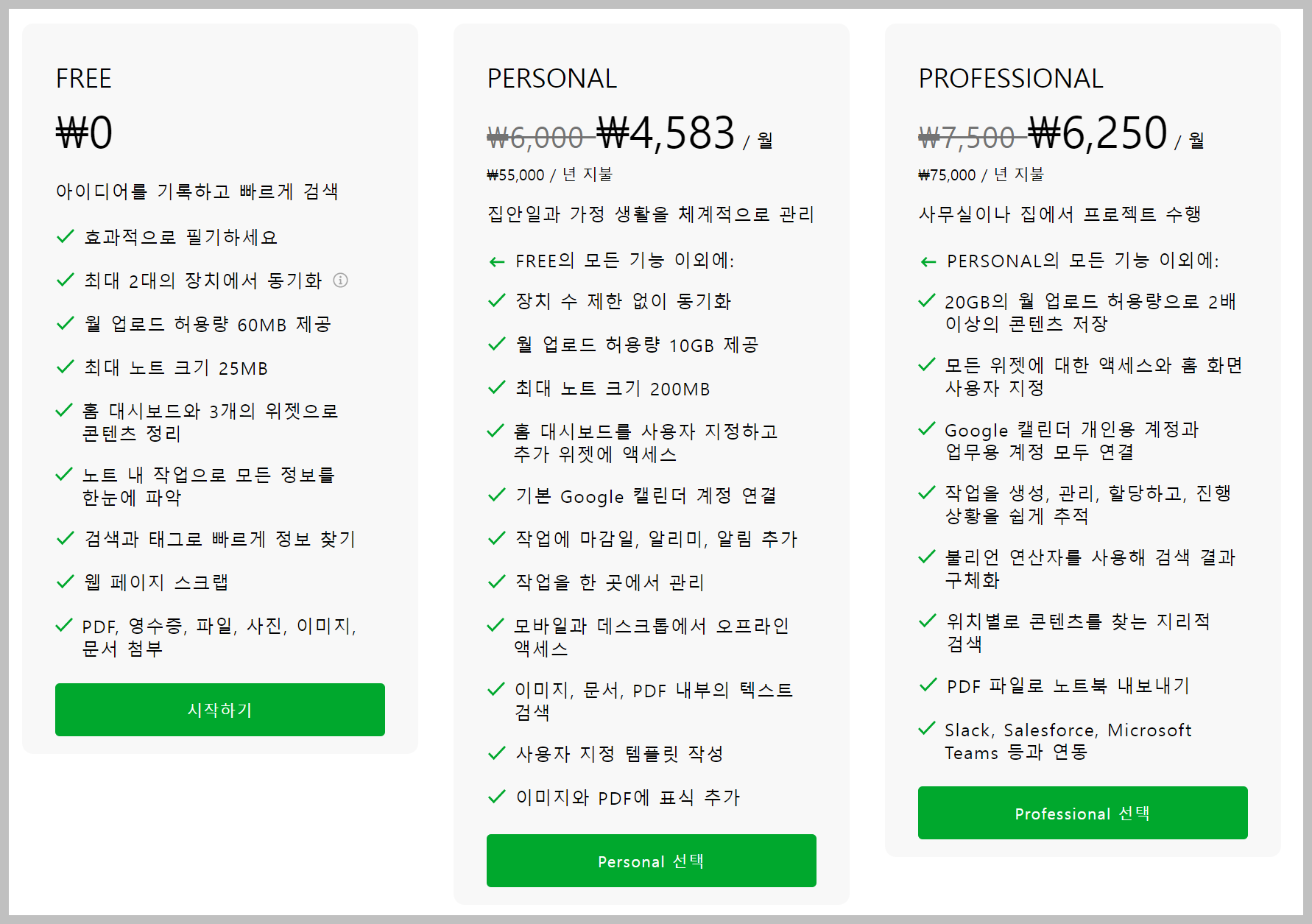 에버노트의 유료정책은 비쌉니다. 년 5.5만원 월 6천원이라는 비용은 너무 비쌉니다. 누군가는 싸다고 할수 있을지 모르겠지만 이런게 쌓여서 옷이 젖는거지요. 그래서 에버노트 대체할만한 서비스를 계속 찾고 있습니다만 이게 쉽지는 않습니다. 너무 에버노트에 익숙해졌습니다.