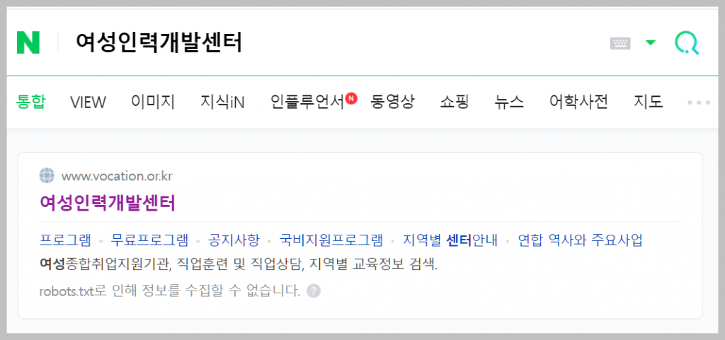 홈페이지에 접속하려면 네이버, 다음과 같은 포털 사이트를 이용하는 것이 흔한 방법입니다. 네이버에서 '여성인력개발센터'를 검색하면 위와 같은 검색 결과가 나올 것입니다. 가장 상위 검색 결과를 클릭하면 원하는 사이트로 쉽게 접속할 수 있습니다.