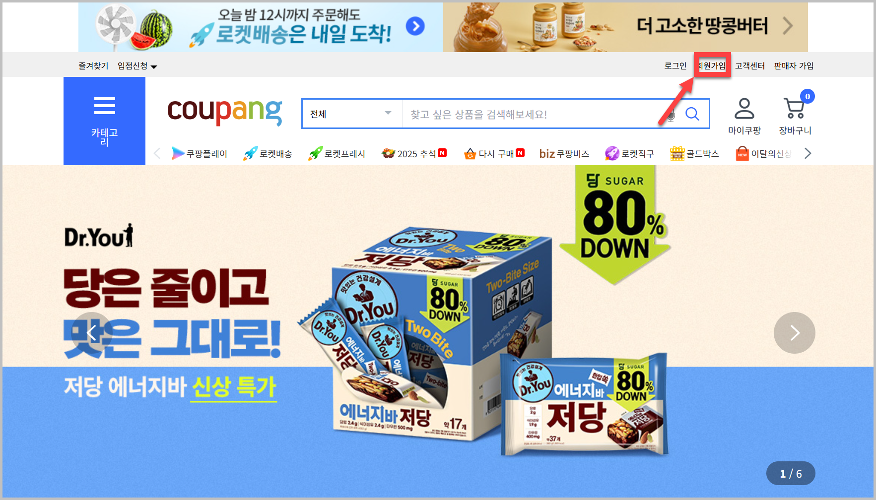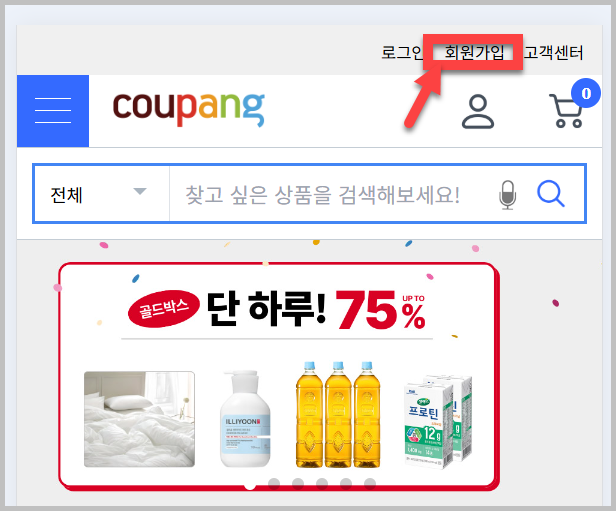 웹 브라우저 주소창에 www.coupang.com 을 입력하여 접속합니다. - '회원가입' 클릭