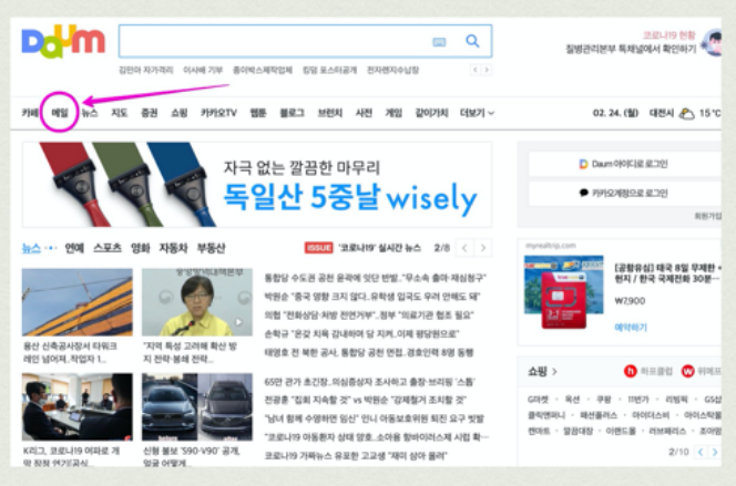 Daum 포털에 접속하시면 위와 같은 화면을 보실 수 있습니다. 화면은 약간 다를 수 있지만, 위의 메뉴는 비슷합니다. 메뉴에는 카페, 뉴스 등이 나열되어 있는데, 여기에서 '메일'을 클릭하면 다음 이멜링 서비스로 접속할 수 있습니다.