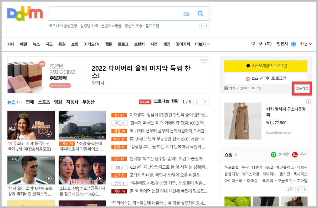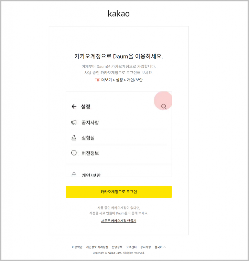 Daum과 Kakao가 합병하면서 이제는 메일 주소를 만들려면 kakao 아이디가 필요합니다. 예전에는 회원가입만 하면 되었지만, 현재는 카카오로 로그인을 먼저 요구하고 있습니다. 다행히 우리나라 대부분 사람들은 카톡을 이용하고 있기에 어렵지 않을거라고 생각합니다.