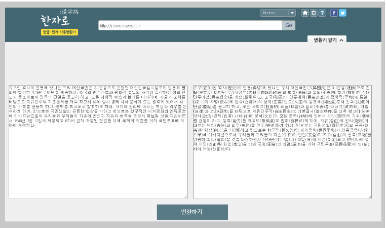 앞서 언급한 존말과는 반대의 기능을 하는 사이트 입니다. 이곳은 한글을 번역하는 경우에 사용됩니다. 왼쪽에 변환을 원하는 내용을 작성하고, 변환하기를 클릭하면 자동으로 한글과 한자가 동시에 나타납니다. 단, 한자 오류가 있을 확률이 높기 때문에 검토하는 것이 좋을 듯합니다.