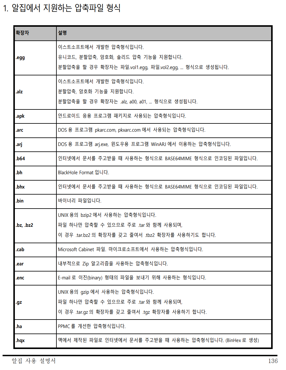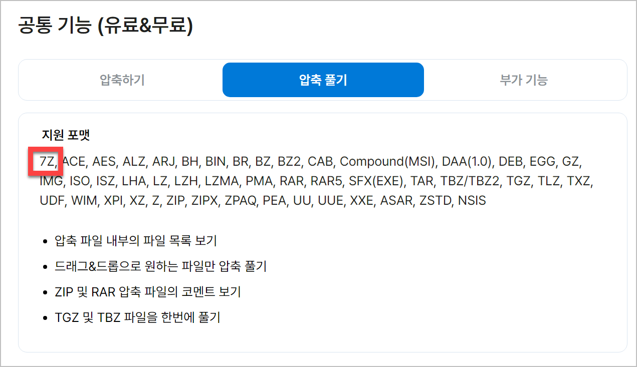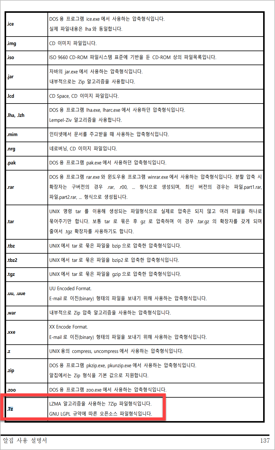 매뉴얼에 나와 있는 풀수 있는 확장자는 위와 같습니다. 꽤나 많은것들을 이용할수 있습니다. 7z는 당연히 포함이 되어 있구요.