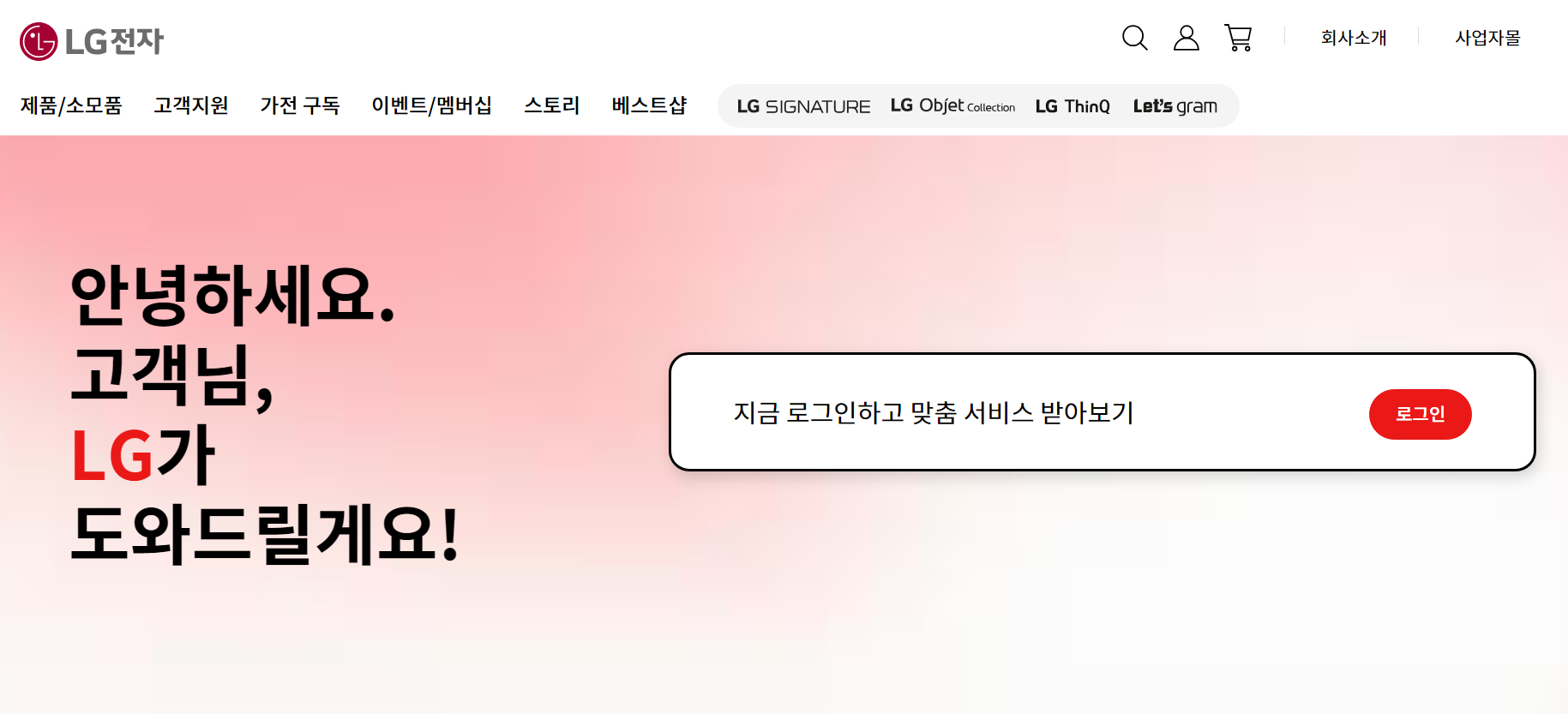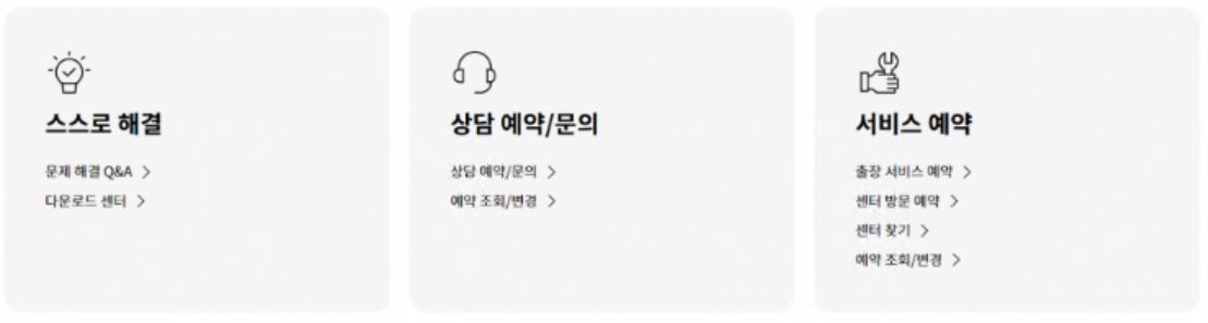 홈페이지에 접속하면 위와같은 모습을 볼 수 있으며 하단에서는 다양한 제품에 대한 고객 지원 방법을 제공하고 있습니다. 컴퓨터의 경우 원격 상담이나 채팅 상담이 유용할 수 있으며, 세탁기의 경우 전화 상담 예약이 적절할 것입니다.