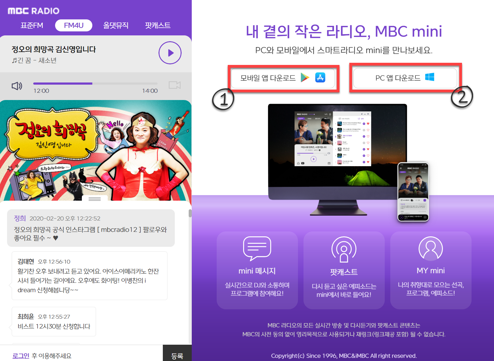 위 링크를 클릭을 하시면 MBC 라디오를 웹에서 들을수 있는 페이지로 들어가실 수 있습니다. 또한 옆에 보면 모바일 앱을 다운로드 할 수 있는 링크가 있습니다.