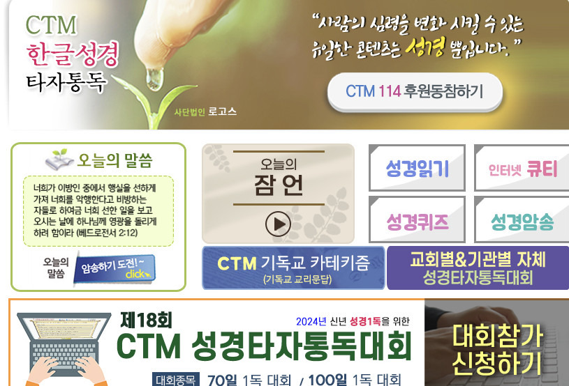 CTM(컴퓨터전문인선교회)에서 운영하는 온라인 서비스로, 성경을 단순히 읽는 것을 넘어서 직접 타이핑하면서 읽도록 만든 시스템입니다. 눈과 손, 뇌가 동시에 움직이면서 자연스럽게 말씀에 집중할 수 있고, 기억에도 오래 남는다는 장점이 있습니다. PC나 스마트폰 웹 브라우저로 접속해 회원가입만 하면 바로 사용할 수 있고, 별도의 설치가 필요하지 않습니다.