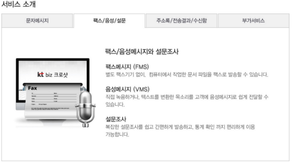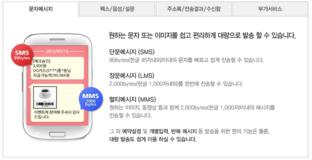 문자 서비스는 기본적인 문자 메세지로, 한 번에 2000건까지 보낼 수 있습니다. 음성 서비스는 녹음된 음성을 보낼 수 있을 뿐만 아니라 글자를 음성으로 변환하여 보낼 수 있습니다. 팩스 서비스는 말 그대로 팩스를 보낼 수 있습니다.