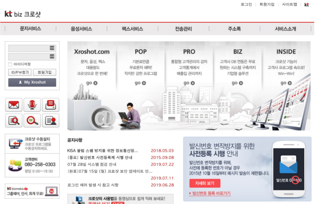 크로샷은 크게 세 가지로 나뉩니다. 첫 번째는 가장 중요한 문자, 두 번째는 음성, 세 번째는 팩스 서비스입니다. 각각에 대해서 자세히 설명해보도록 하겠습니다.