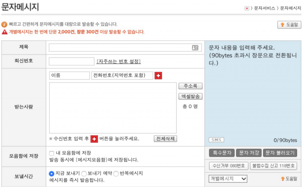 일반적인 생활에서 다량의 문자를 보내는 경우는 거의 없습니다. 요즘은 카카오톡 같은 메신저 프로그램을 통해 연락을 보내는 경우가 더 많기 때문인것 같아요. 문자를 보내더라도 단체 몇십 건 정도입니다. 하지만 일정 수준 이상으로 갯수가 늘어나면 핸드폰으로는 처리가 불가능합니다. 그럴 때는 여러 서비스를 이용해야 합니다.